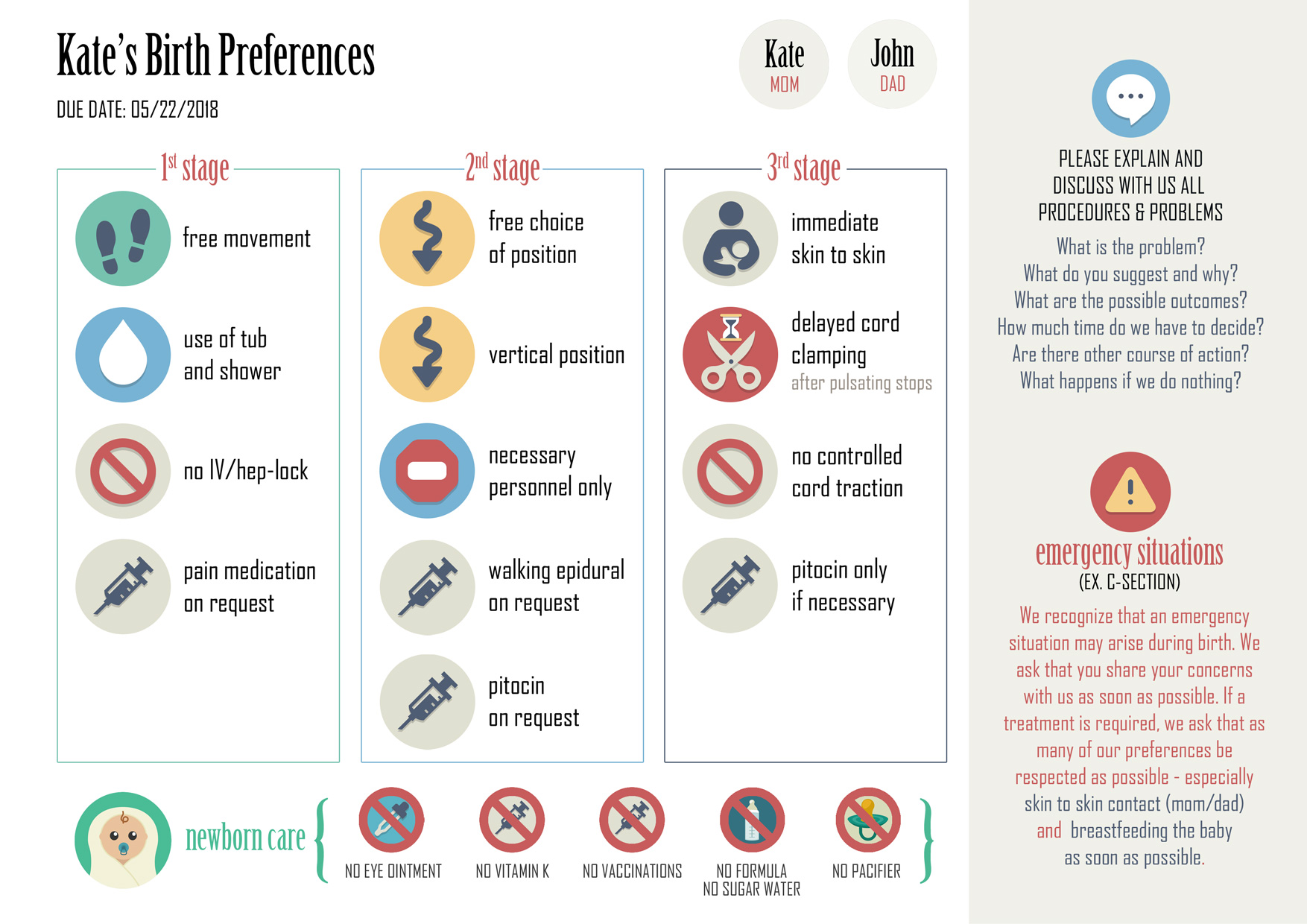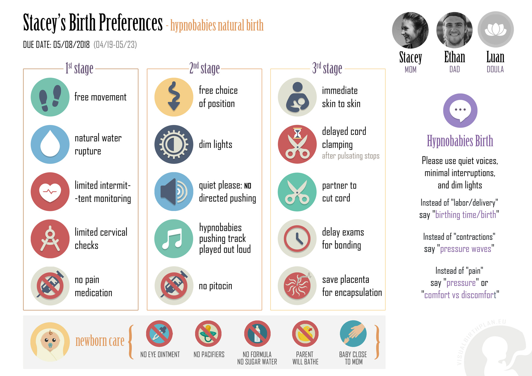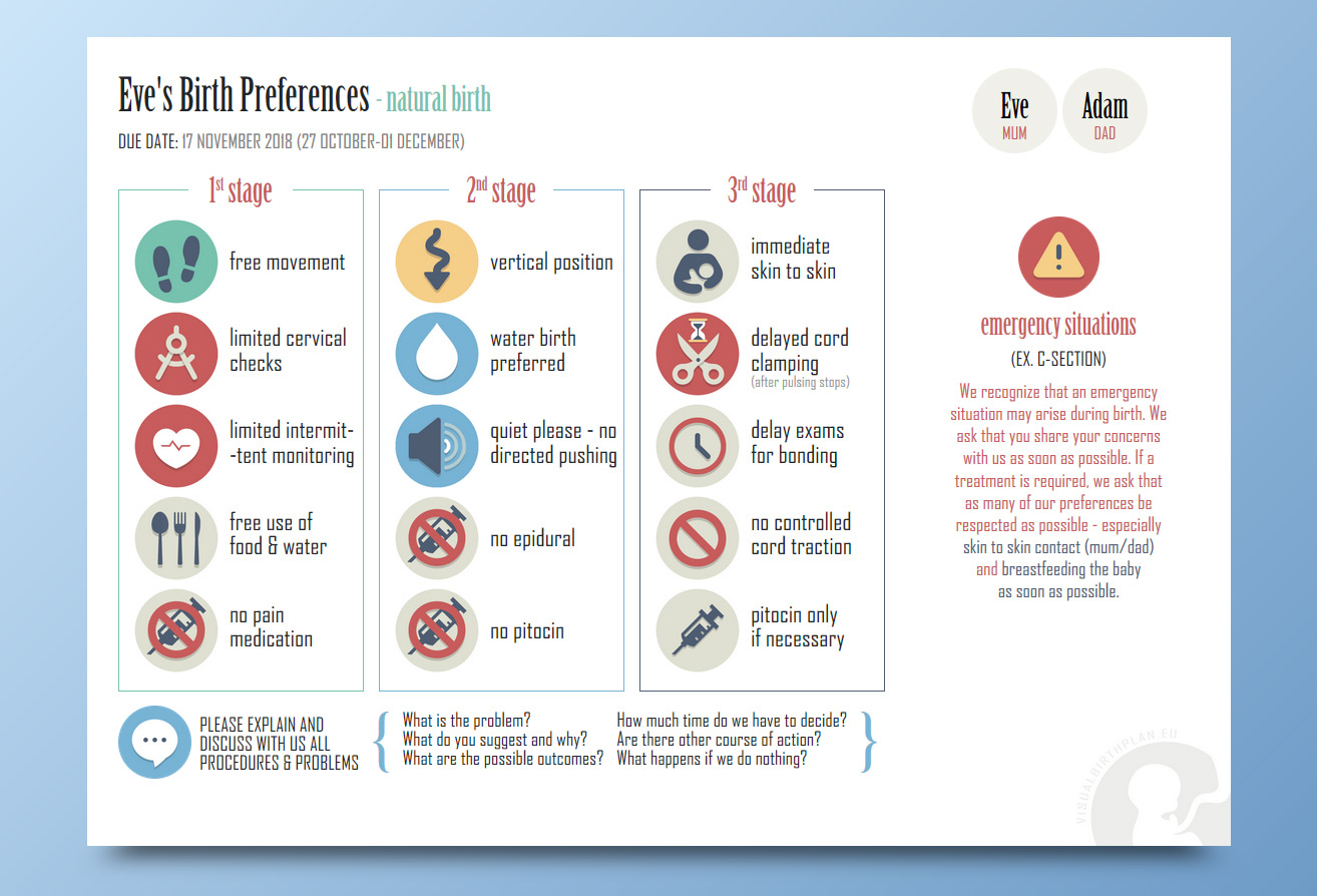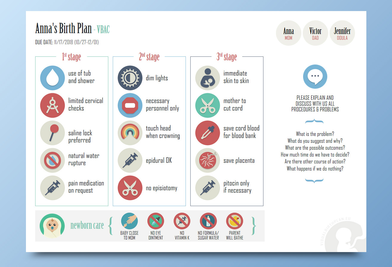 The visual birth plan is a great reminder to you and your birth team that you have choices and that you can make decisions together. Aside from the birth preferences for all stages of labor, the visual birth plan can include six helpful questions to be asked in case of emergencies, names and roles of people on your birth team and crucial details about your pregnancy and health.