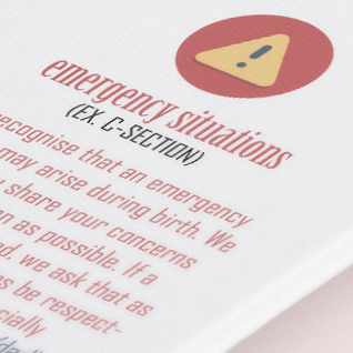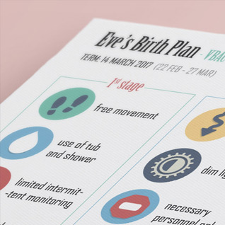 The visual birth plan is a great reminder to you and your birth team that you have choices and that you can make decisions together. Aside from the birth preferences for all stages of labor, the visual birth plan can include six helpful questions to be asked in case of emergencies, names and roles of people on your birth team and crucial details about your pregnancy and health.